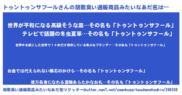 | 意味不明あだ名 | 『住所不定無職トゥントゥンサフール(74歳)』 |