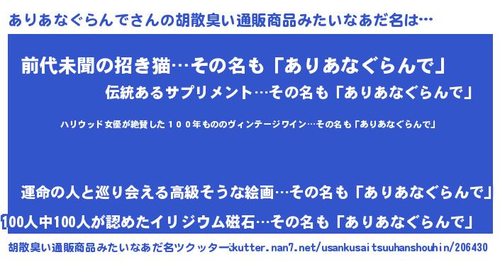 | 意味不明あだ名 | 『住所不定無職ありあなぐらんで(8歳)』 |