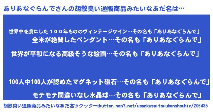 | 男性向けラノベタイトル風あだ名 | 『ありあなぐらんでに滅ぼされるだけの簡単なお仕事です』 |