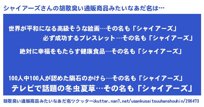 | 男性向けラノベタイトル風あだ名 | 『シャイアーズという概念が存在しない退屈な世界 』 |