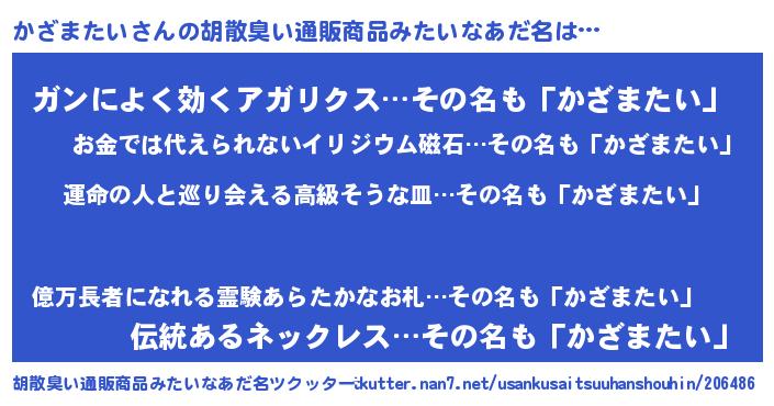 | 男性向けラノベタイトル風あだ名 | 『かざまたい~年齢イコール彼女いない歴の魔法使い~』 |