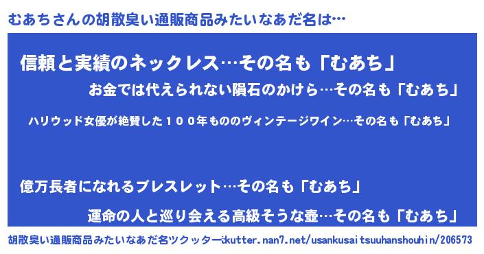 | 男性向けラノベタイトル風あだ名 | 『魔弾の王とむあち』『むあちの憂鬱』 |