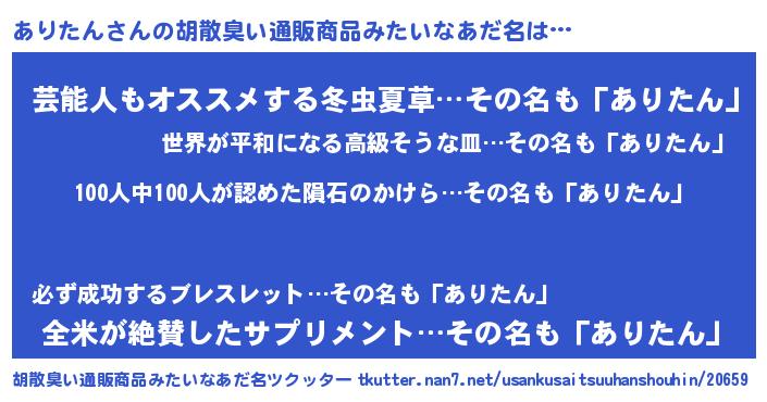 | 男性向けラノベタイトル風あだ名 | 『おまえをオタクにしてやるから、俺をありたんにしてくれ! 』 |