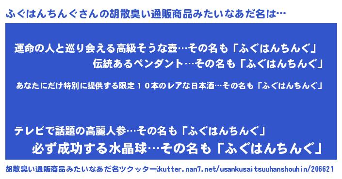 | 男性向けラノベタイトル風あだ名 | 『この素晴らしい世界にふぐはんちんぐを!』 |