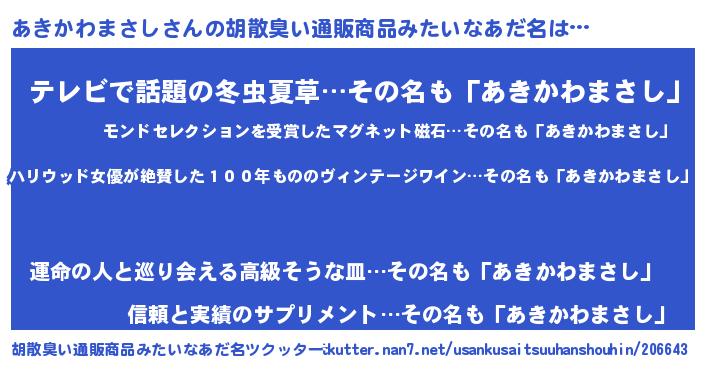 | 意味不明あだ名 | 『住所不定無職あきかわまさし(8歳)』 |