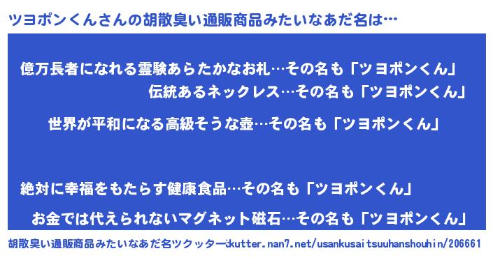 | 意味不明あだ名 | 『ツヨポンくんフォーエバー』 |
