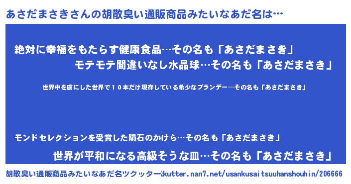 | ヘコむあだ名 | 『あさだまさき(苦笑)』『豆乳』 |