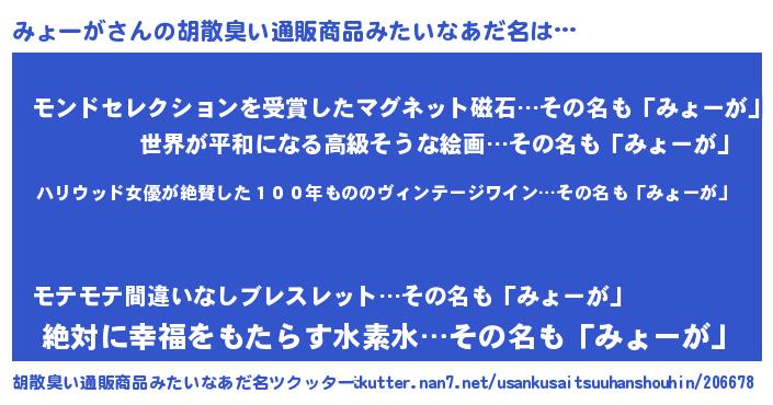 | 意味不明あだ名 | 『住所不定無職みょーが(6歳)』 |
