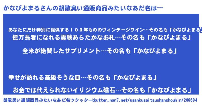 | 男性向けラノベタイトル風あだ名 | 『かなぴよまるの嫁は女の子じゃないと思った?』 |