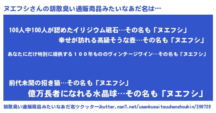 男性向けラノベタイトル風あだ名 | 『この素晴らしい世界にヌエフシを!』 |