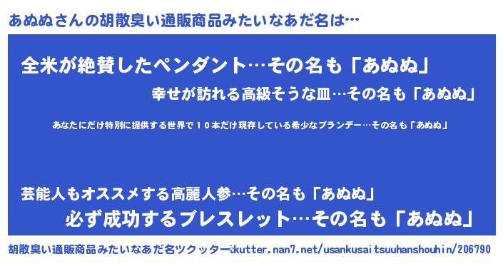 | 意味不明あだ名 | 『住所不定無職あぬぬ(91歳)』 |