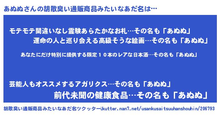 | 意味不明あだ名 | 『住所不定無職あぬぬ(68歳)』『自称あぬぬ』 |