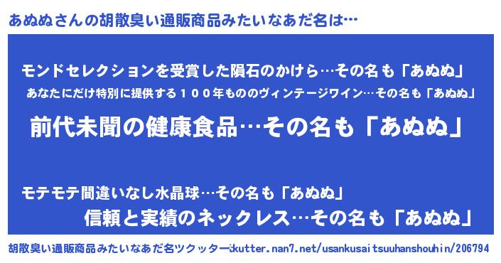 | ヒーロー風カッコイイあだ名 | 『ネオアヌヌ』『慈愛の使者あぬぬ』 |