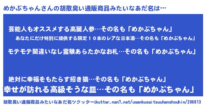 | 男性向けラノベタイトル風あだ名 | 『めかぶちゃんに滅ぼされるだけの簡単なお仕事です』 |