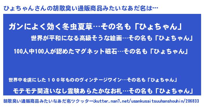 | 男性向けラノベタイトル風あだ名 | 『おまえをオタクにしてやるから、俺をひょちゃんにしてくれ! 』 |