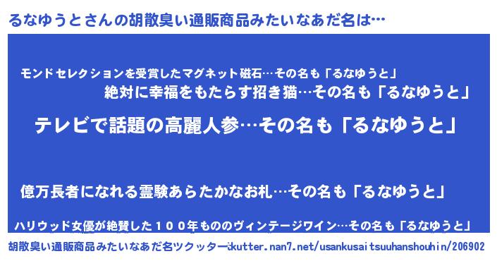 | 意味不明あだ名 | 『自称るなゆうと』『永久保存るなゆうと』 |