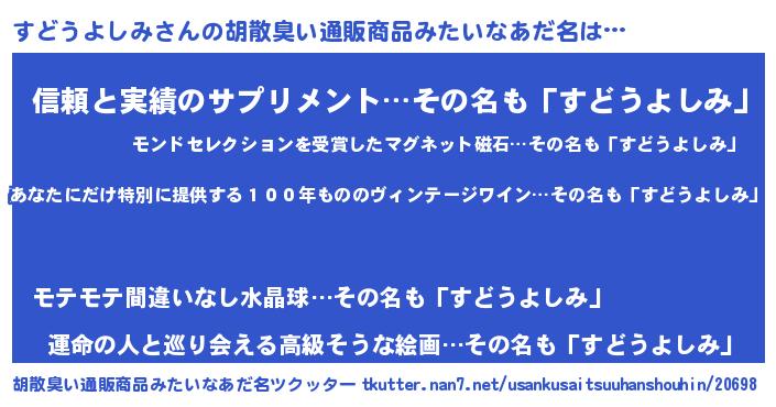 | 男性向けラノベタイトル風あだ名 | 『この素晴らしい世界にすどうよしみを!』 |