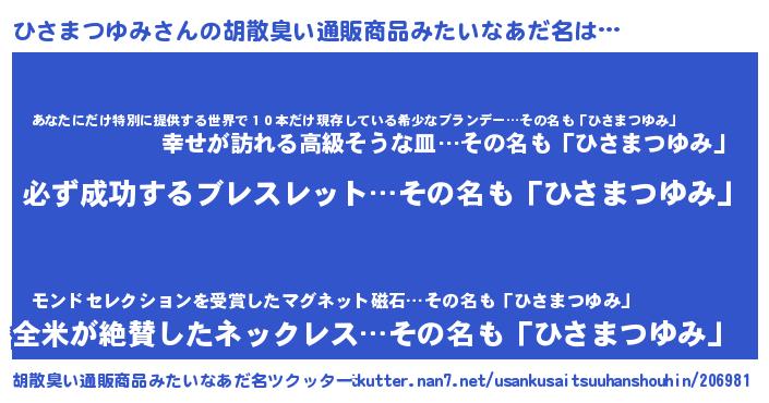 | 恥ずかしいあだ名 | 『プリティーひさまつゆみ』『ひさっちょ』 |
