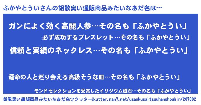| 意味不明あだ名 | 『とにかく怪しいふかやとうい』 |