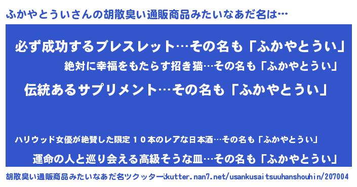 | ヘコむあだ名 | 『ふか太郎』『ふかふぇ~』 |