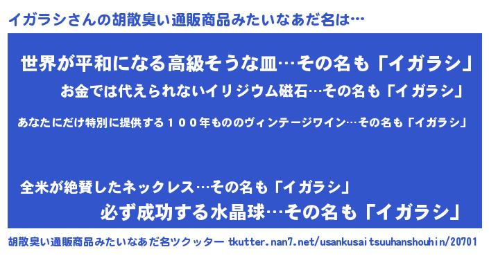 | 男性向けラノベタイトル風あだ名 | 『この素晴らしい世界にイガラシを!』 |