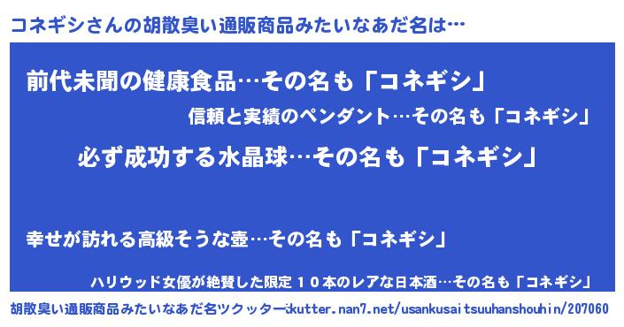 男性向けラノベタイトル風あだ名 | 『コネギシの憂鬱』『魔弾の王とコネギシ』 |