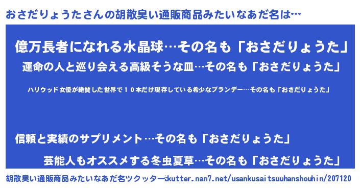 意味不明あだ名 | 『住所不定無職おさだりょうた(74歳)』 |