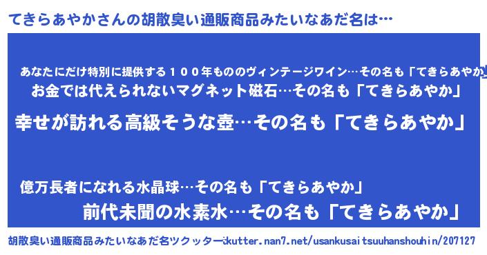 女子向けラノベタイトル風あだ名 | 『てきらあやかの雑貨屋さん』 |