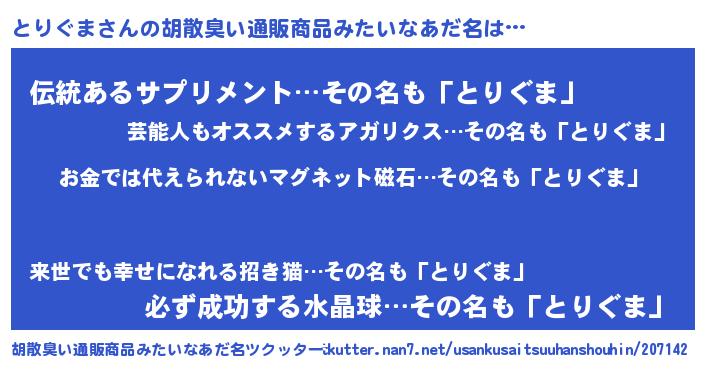 男性向けラノベタイトル風あだ名 | 『おまえをオタクにしてやるから、俺をとりぐまにしてくれ! 』 |