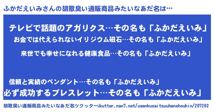 ヘコむあだ名 | 『ふかだえいみ(爆)』『ふかにゅー』 |