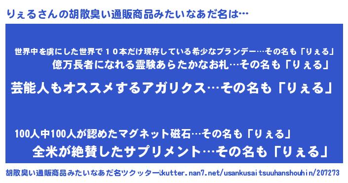 意味不明あだ名 | 『自称りぇる』『住所不定無職りぇる(71歳)』 |