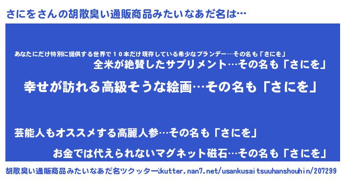 女子向けラノベタイトル風あだ名 | 『さにをの雑貨屋さん』『さにを恋絵巻』 |