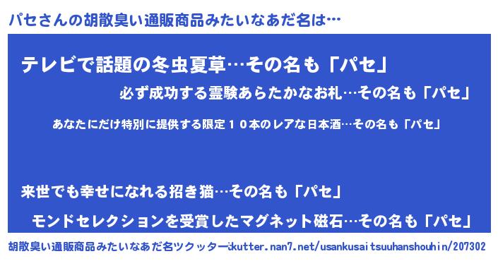意味不明あだ名 | 『住所不定無職パセ(40歳)』『自称パセ』 |