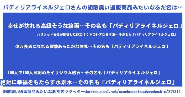 | 男性向けラノベタイトル風あだ名 | 『パディリアライネルジェロ~年齢イコール彼女いない歴の魔法使い~』 |
