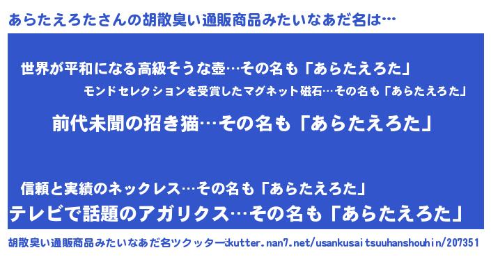 | ヘコむあだ名 | 『あらたえろた(笑)』『なまこ酢』 |