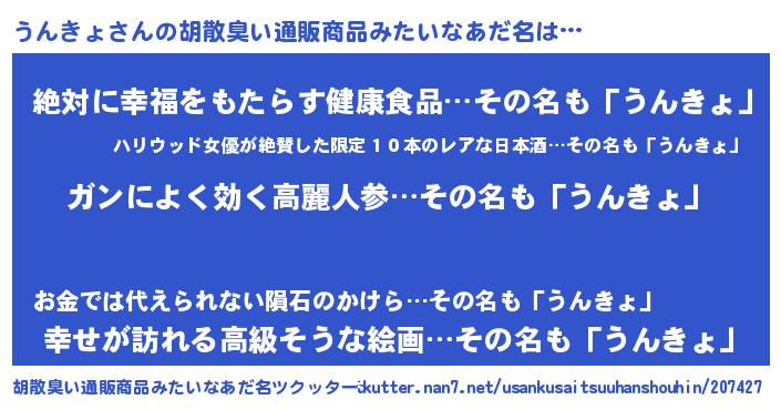 | 男性向けラノベタイトル風あだ名 | 『緋弾のウンキョ』『ウンキョスレイヤー』 |