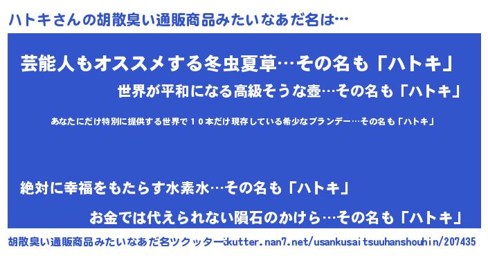 | 男性向けラノベタイトル風あだ名 | 『この素晴らしい世界にハトキを!』 |