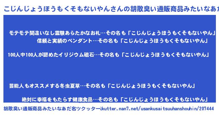 | 男性向けラノベタイトル風あだ名 | 『おまえをオタクにしてやるから、俺をこじんじょうほうもくそもないやんにしてくれ! 』 |