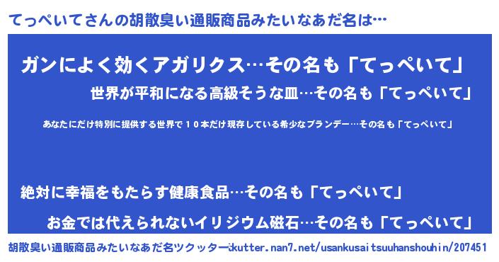 | 欧米人風あだ名 | 『アンジェラ・てっぺいて』 |