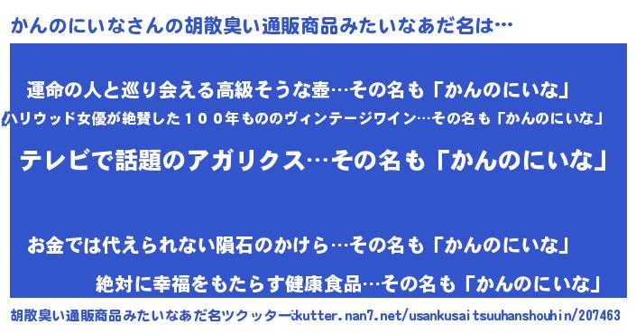 | 男性向けラノベタイトル風あだ名 | 『転生したらかんのにいなだった件』 |