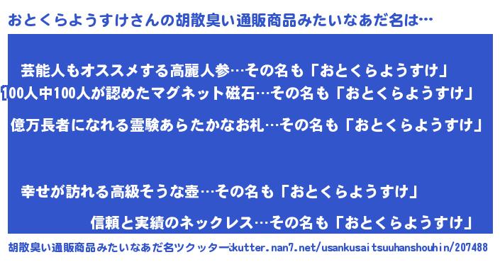 | 男性向けラノベタイトル風あだ名 | 『おとくらようすけに滅ぼされるだけの簡単なお仕事です』 |