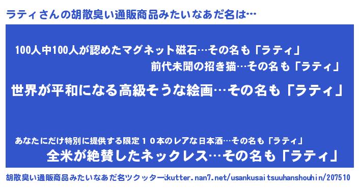 | 男性向けラノベタイトル風あだ名 | 『はたらくラティさま!』『緋弾のラティ』 |