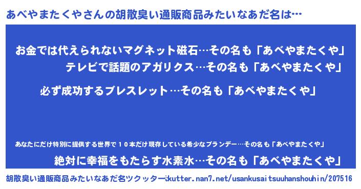 | 男性向けラノベタイトル風あだ名 | 『アベヤマタクヤスレイヤー』 |
