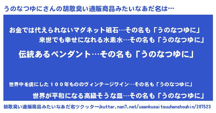 | 男性向けラノベタイトル風あだ名 | 『うのなつゆにに滅ぼされるだけの簡単なお仕事です』 |