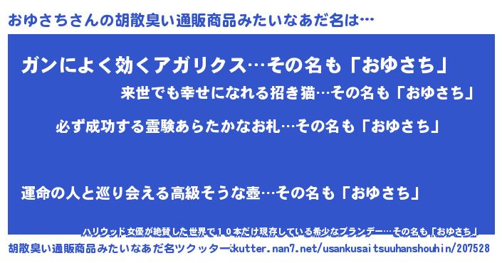 | 男性向けラノベタイトル風あだ名 | 『おゆさちの憂鬱』『魔弾の王とおゆさち』 |