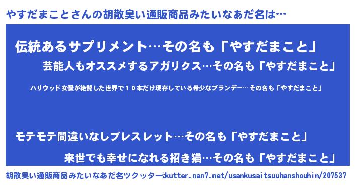 | ヘコむあだ名 | 『やすぷりん』『やすだまこと(爆)』 |
