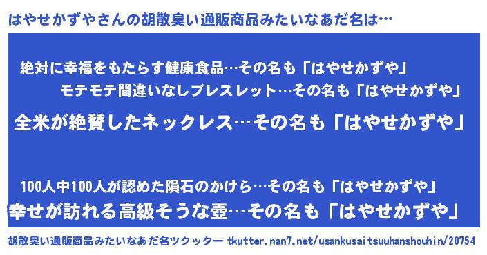 | 男性向けラノベタイトル風あだ名 | 『うちのはやせかずやが世界を掌握している!』 |
