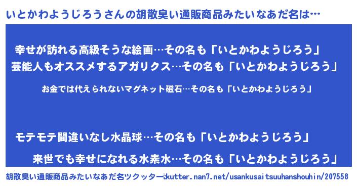 | 男性向けラノベタイトル風あだ名 | 『いとかわようじろうに滅ぼされるだけの簡単なお仕事です』 |