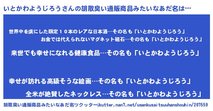 | 男性向けラノベタイトル風あだ名 | 『いとかわようじろうという概念が存在しない退屈な世界 』 |
