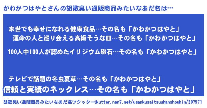 | ヘコむあだ名 | 『かわかつはやと(爆)』『かわ太郎』 |